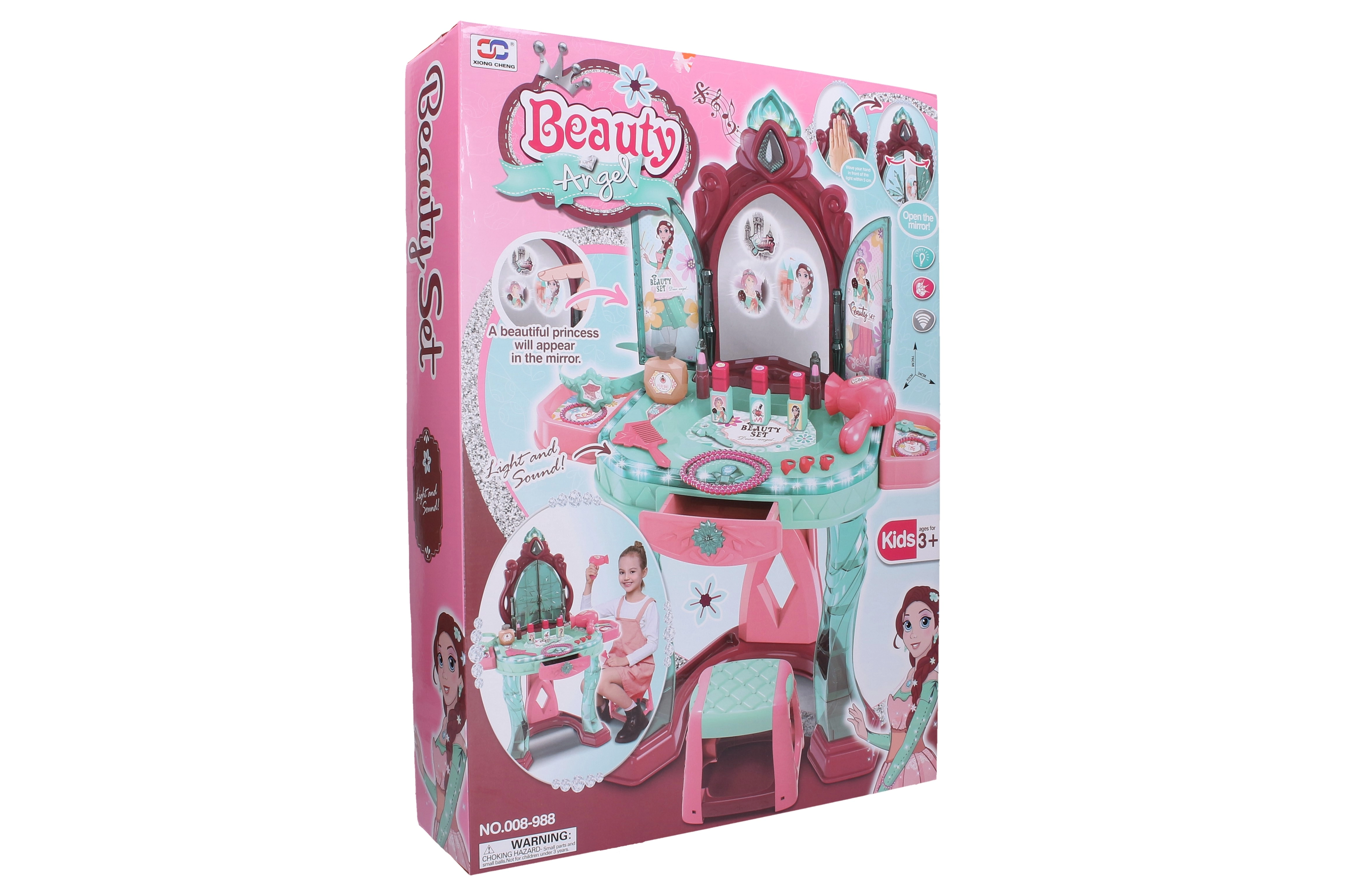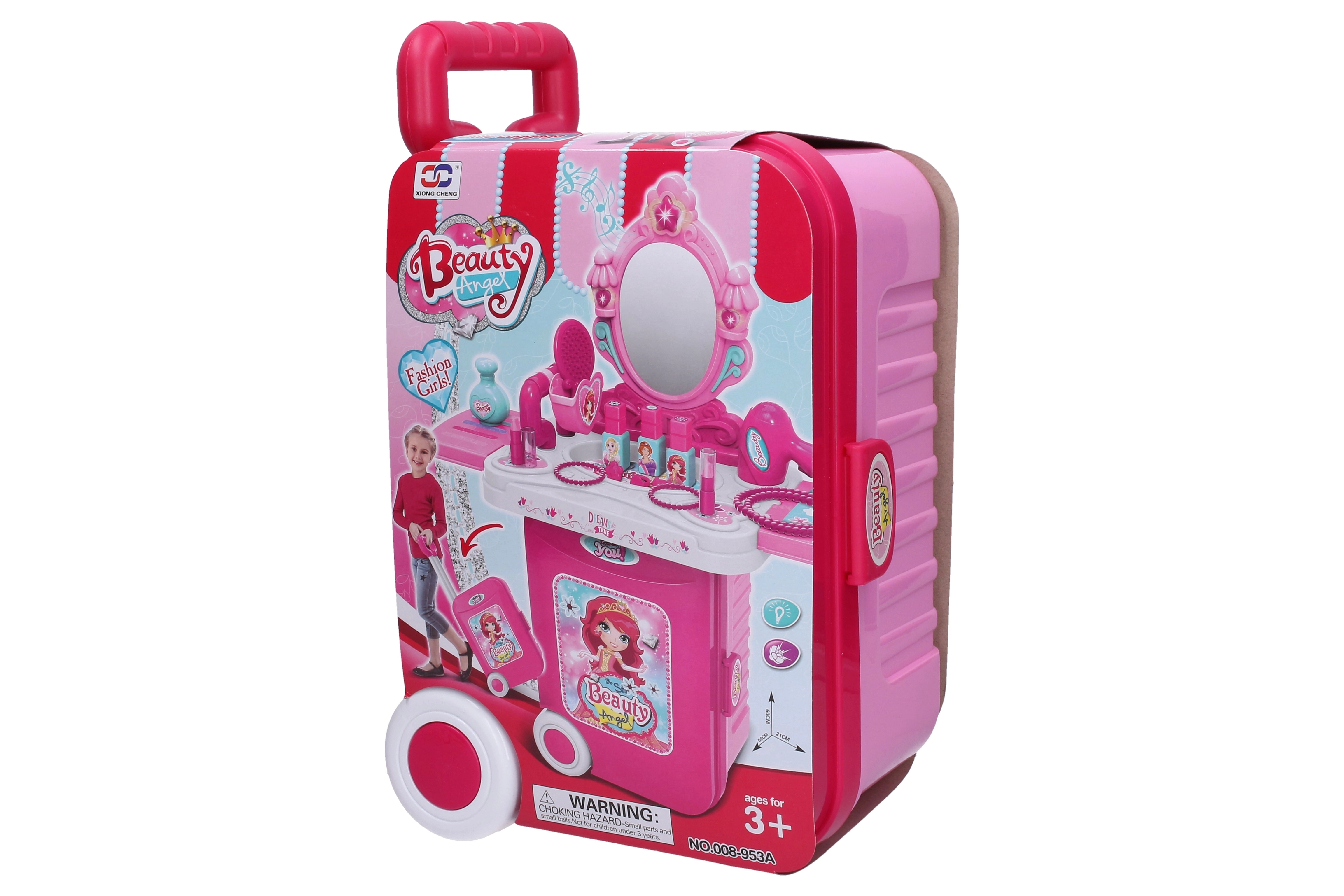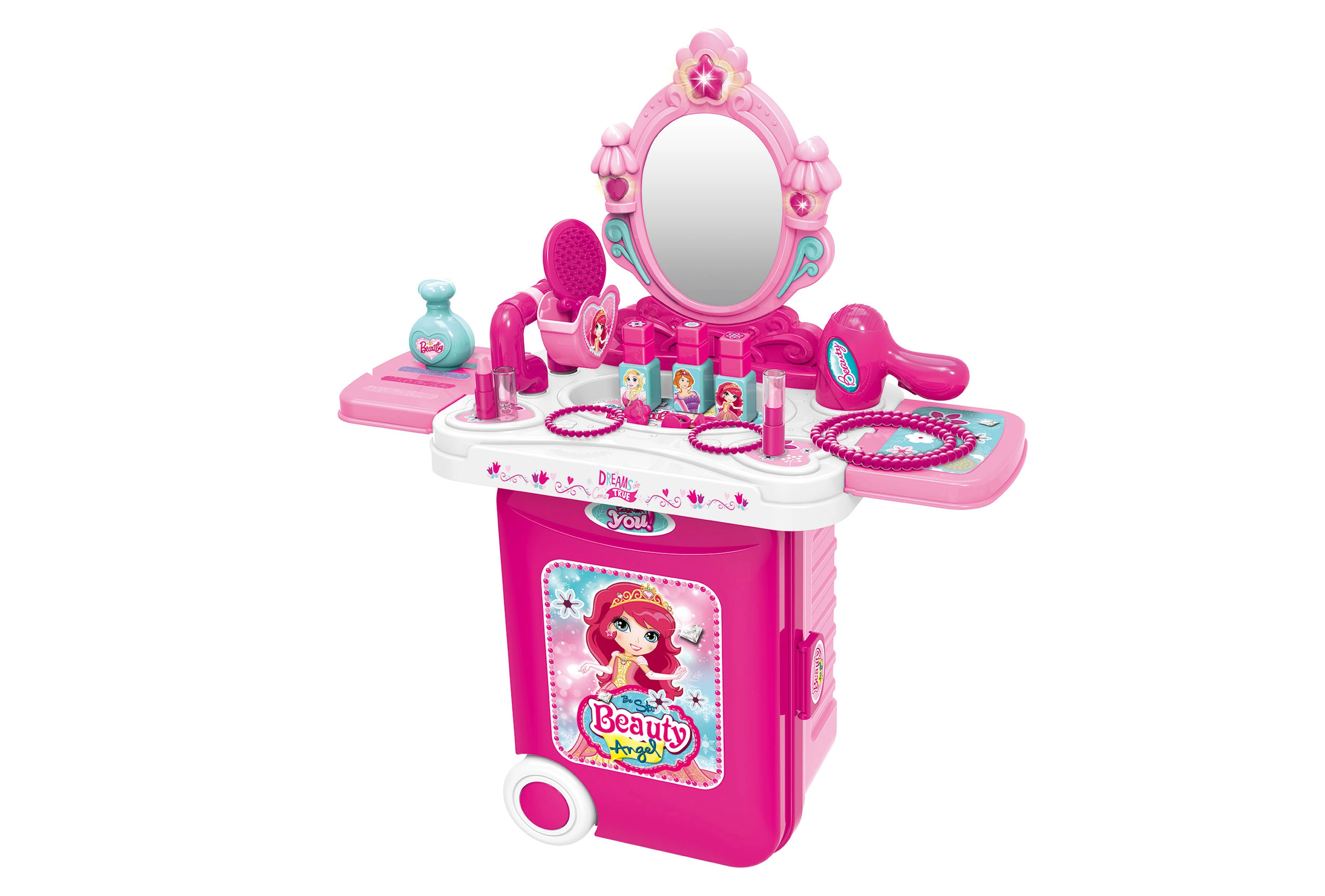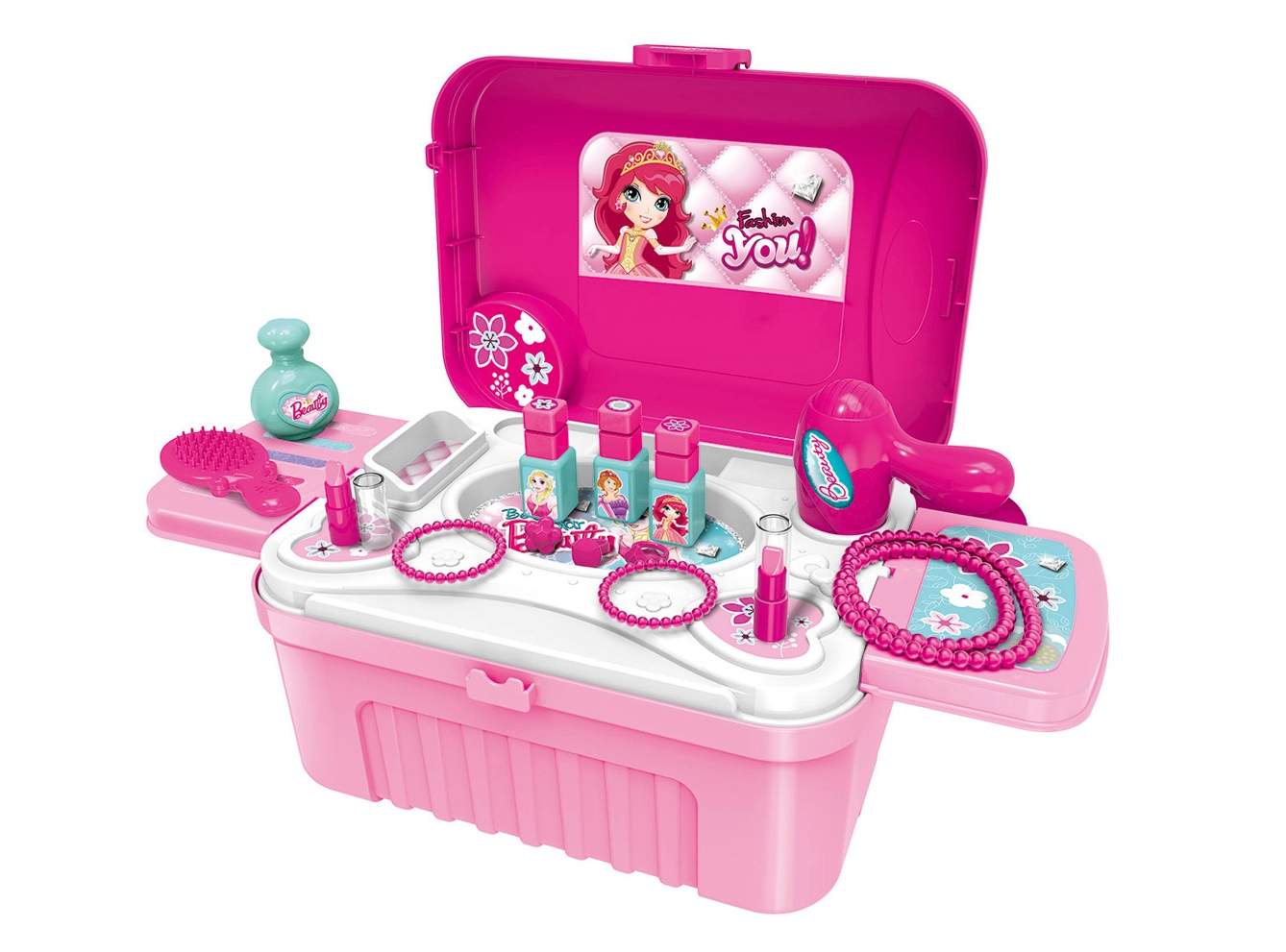 Kozmetické kufríky, toaletné stolíky a kadernícke sady obsahujú hrebene, kefy, čelenky, sponky, natáčky, detský fén, žehličku či kulmu (hračky), bezpečné zrkadielka a bohaté príslušenstvo. Detský make‑up býva netoxický, umývateľný a šetrný k pokožke; laky na nechty na vodnej báze sa ľahko zmyjú bez acetónu. Na výber sú odolné plastové aj drevené sady, kompaktné kufríky na cesty aj väčšie kozmetické stolíky na plnohodnotnú hru na povolania.
