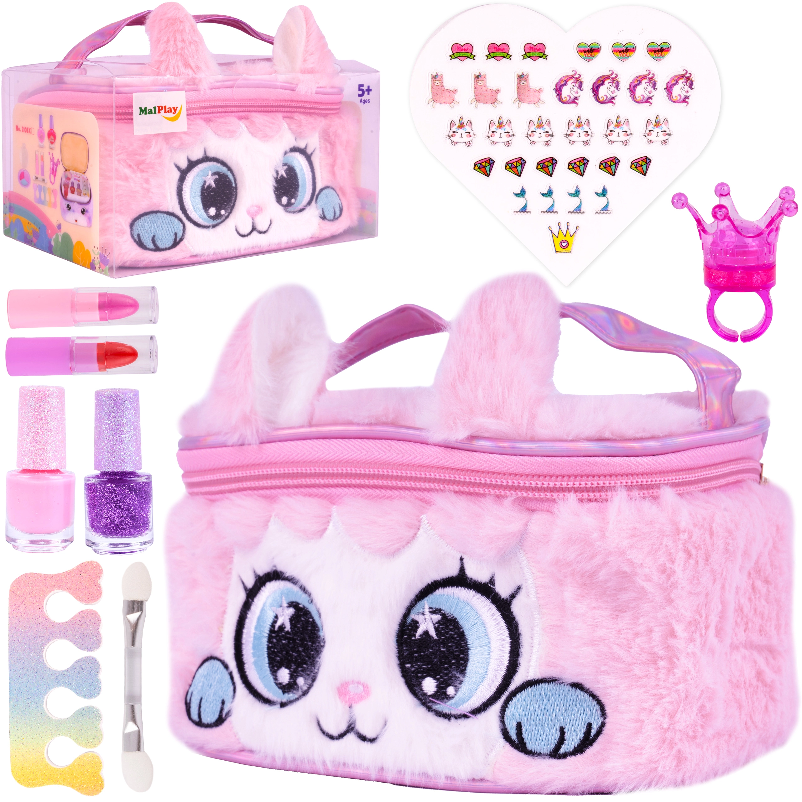 Kozmetické kufríky, toaletné stolíky a kadernícke sady obsahujú hrebene, kefy, čelenky, sponky, natáčky, detský fén, žehličku či kulmu (hračky), bezpečné zrkadielka a bohaté príslušenstvo. Detský make‑up býva netoxický, umývateľný a šetrný k pokožke; laky na nechty na vodnej báze sa ľahko zmyjú bez acetónu. Na výber sú odolné plastové aj drevené sady, kompaktné kufríky na cesty aj väčšie kozmetické stolíky na plnohodnotnú hru na povolania.