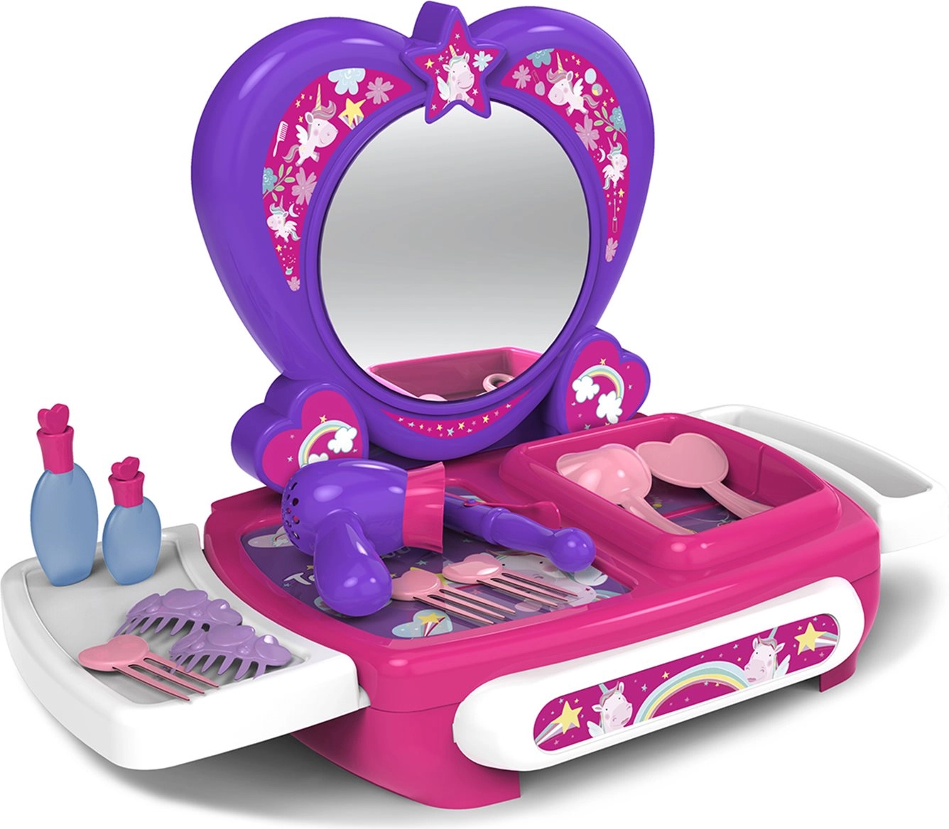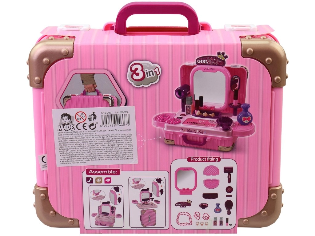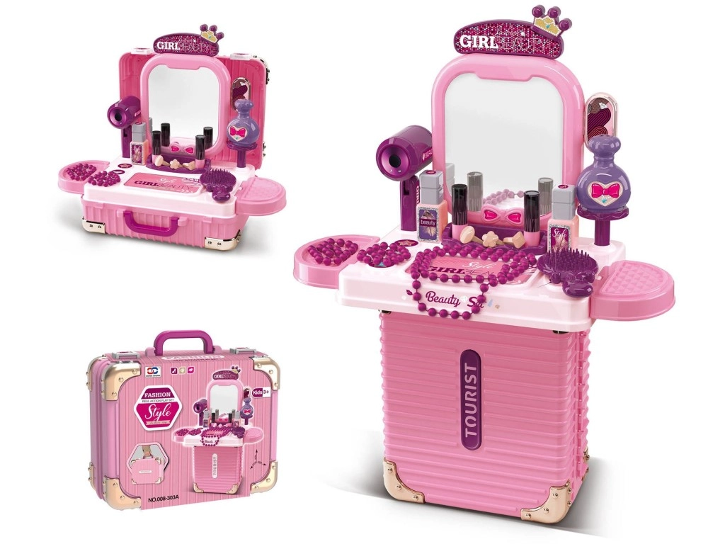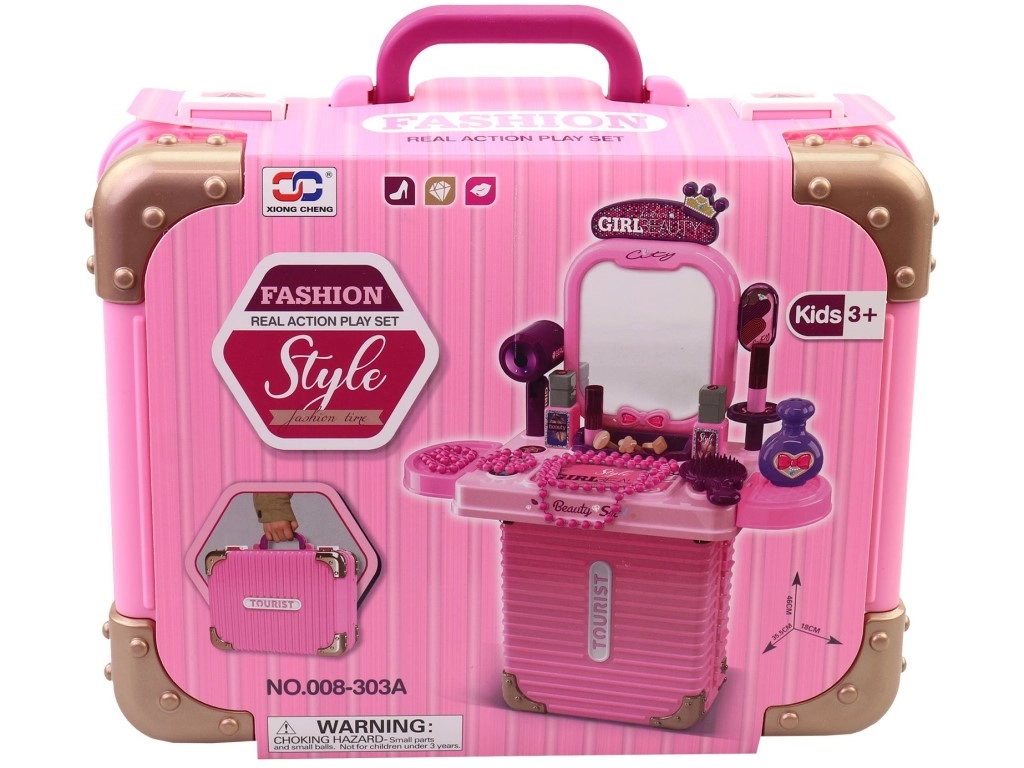 Kozmetické kufríky, toaletné stolíky a kadernícke sady obsahujú hrebene, kefy, čelenky, sponky, natáčky, detský fén, žehličku či kulmu (hračky), bezpečné zrkadielka a bohaté príslušenstvo. Detský make‑up býva netoxický, umývateľný a šetrný k pokožke; laky na nechty na vodnej báze sa ľahko zmyjú bez acetónu. Na výber sú odolné plastové aj drevené sady, kompaktné kufríky na cesty aj väčšie kozmetické stolíky na plnohodnotnú hru na povolania.