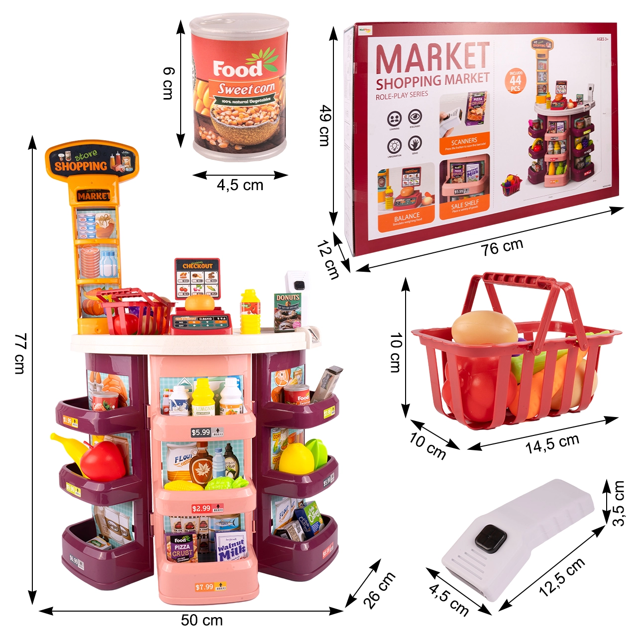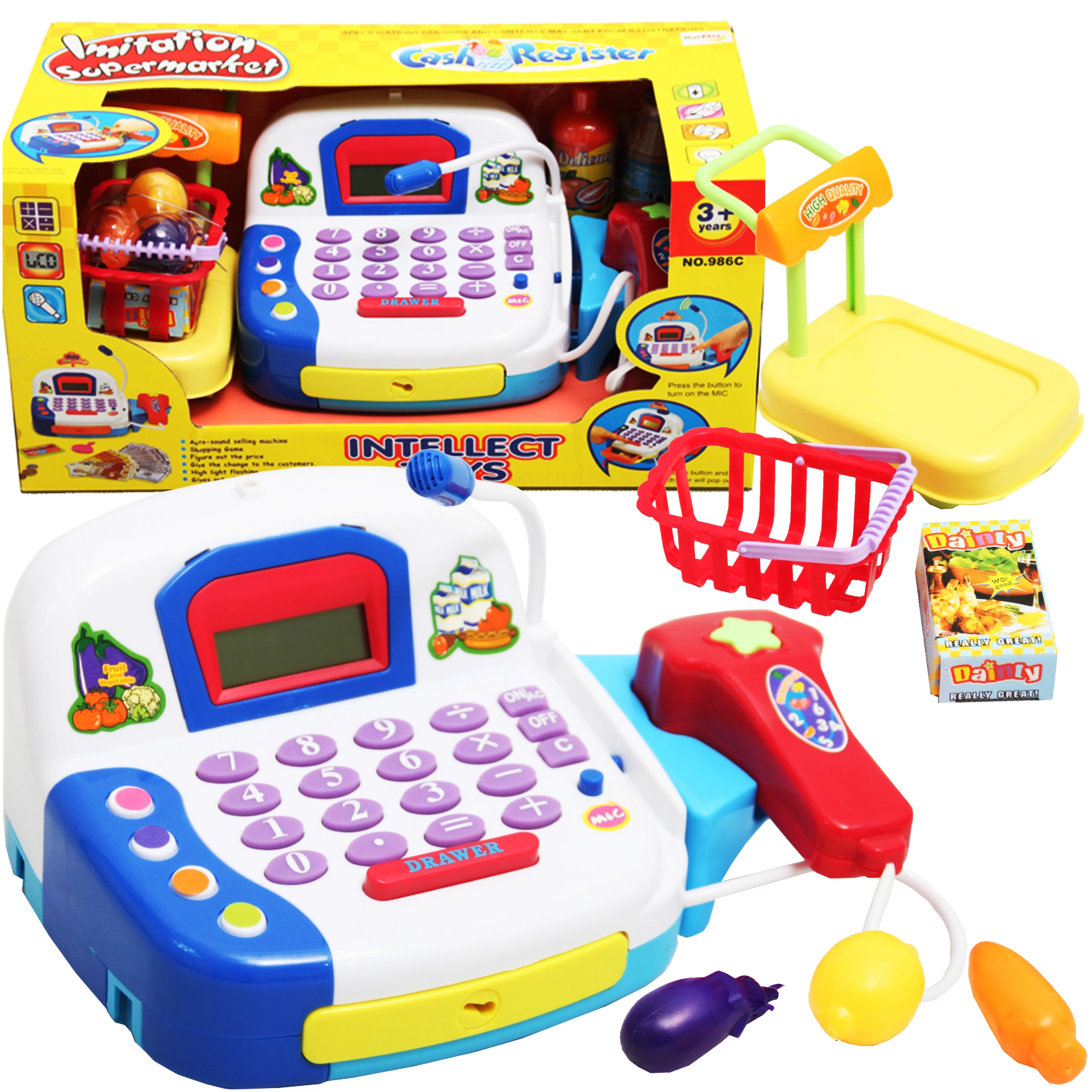 Pokladne pre deti ponúkajú čítačku čiarových kódov a skener, terminál na platobnú kartu, bankovky a mince, kalkulačku, mikrofón aj svetelné a zvukové efekty – ideálne učenie hrou a tréning obsluhy pokladne. Vďaka nim sa deti učia počítať, rozvíjajú komunikáciu so zákazníkom a finančnú gramotnosť. Potraviny do detského obchodu (ovocie, zelenina, pečivo, krabičky či plechovky) z dreva, plastu aj textilu, často na suchý zips alebo s magnetom, podporujú fantáziu a jemnú motoriku.