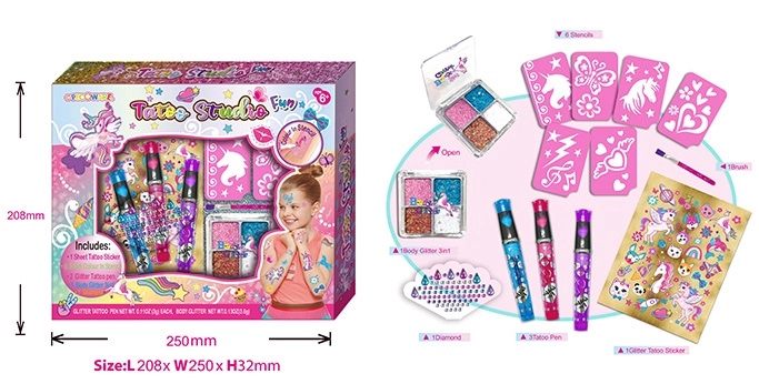 Nájdete tu tetovacie fixky na telo, farebné šablóny, pečiatky, glitrové tetovanie, tetovacie obtlačky aj nálepky – všetko s dôrazom na netoxické zloženie, umývateľnosť a jednoduchú aplikáciu. Dočasné farby na telo a detské tetovacie sady sa dajú ľahko zmyť vodou a mydlom, takže experimentovanie s dizajnmi, nápismi a motívmi je vždy bez starostí. Hra na tatérku rozvíja jemnú motoriku, presnosť ruky, farebné cítenie aj sociálne zručnosti pri objednávke a starostlivosti o klienta. Deti si vyskúšajú plánovanie motívu, prácu so šablónami a bezpečné postupy v tetovacom štúdiu, naučia sa trpezlivosti a spolupráci. Tetovacie doplnky a kostýmy krásne doplnia domáci salón krásy a podporia sebavyjadrenie, fantáziu aj radosť z tvorby.