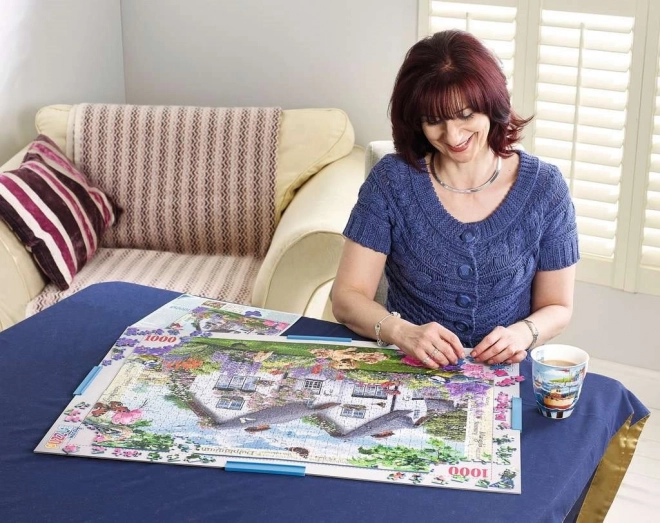 Skladacia podložka RAVENSBURGER Puzzle Handy je chytré riešenie pre milovníkov puzzle s obmedzeným priestorom. Vďaka vodiacim linkám pre štandardné rozmery 500 a 1000 dielikov (klasický tvar, nie panorama) ľahko poskladáte a prenesiete rozpracované puzzle bez obáv z vysypania dielikov.