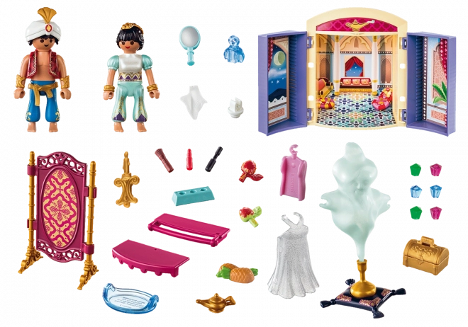 - 1x figúrka orientálneho princa, 1x figúrka princeznej, čarovná lampa, truhlica a ďalšie doplnky, uzatvárateľný hrací box