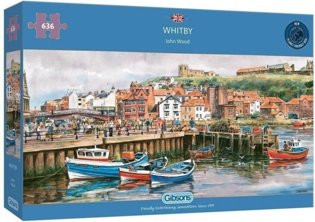 Objavte krásy Whitby v Yorkshire s týmto panoramatickým puzzle od značky Gibsons. Skladanie tohto puzzle o 636 kúskov vás prenesie do malebného prístavu, kde sa nad rušnými ulicami týči zrúcanina opátstva sv. Hildy na útese East Cliff.