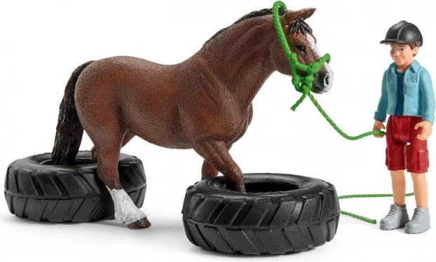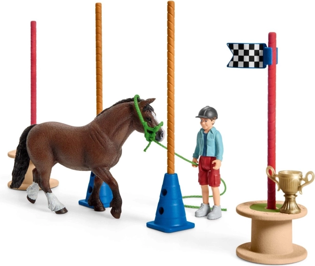 Obsahuje waleského poníka, figúrku chlapca, prekážky, arch nálepiek a ďalšie. Ideálne pre tréning aj pretekové scenáre.
