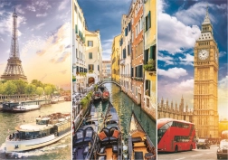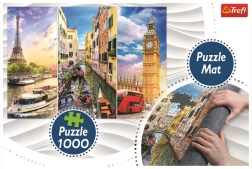 Všetko, čo potrebujete na skladanie puzzle, nájdete v jednej krabici. Sada kombinuje esteticky pútavú koláž miest Paríž–Benátky–Londýn a funkčnú rolovaciu podložku, ktorá šetrí miesto a chráni rozostavané aj hotové puzzle. Na podložke sú prehľadne vyznačené obrysy na skladanie puzzle TREFL vo veľkostiach 500, 500 panorama, 1000 a 1500 dielikov, takže vždy presne viete, kam umiestniť skladaný obraz.