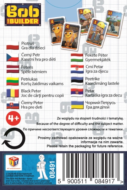 Detská hra Černy Peter s obrázkami obľúbeného Boba Staviteľa je ideálnou zábavou pre každého malého staviteľa. Hra obsahuje 25 kariet, ktoré hráči rozdajú medzi sebou. Cieľom je tvoriť dvojice kariet a zbaviť sa všetkých kariet z ruky. Vyhráva hráč, ktorý nemá Černeho Petra.