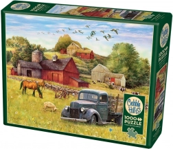 Na puzzli je zobrazená očarujúca scéna farmy s červenou stodolou, starým nákladiakom a zvieratami pasúcimi sa na lúke.