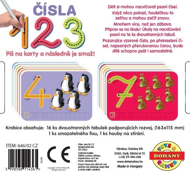 Zábavná edukačná sada pre deti od 5 rokov, ktorá podporuje učenie čísel, rozvoj jemnej motoriky a pamäti. Vďaka stierateľným kartám môžu deti písať čísla, trénovať ich opakovane a bez obáv chyby jednoducho zmazať hubkou.