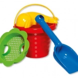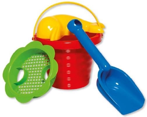 Vedierko, lopatka, formička a sito – ideálna kombinácia na tvorbu pieskových hradov a hry pri vode.
