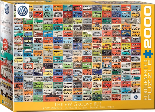 Puzzle VW Groovy Bus je koláž fotografií nemeckých áut značky Volkswagen. Medzi obrázkami nechýba ani bus ozdobený kvetmi, veď tento model najviac preslávili práve deti kvetov (hippies).