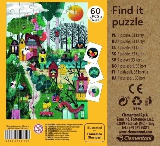 Puzzle s jesenným rozprávkovým motívom a 33 kartami, vďaka ktorým zábava nekončí poskladaním obrázka. Po zložení motívu hľadajte motív z kartičky na zloženom obrázku. Podarí sa vám nájsť všetky? Súčasťou balenia je aj predloha. Detské puzzle patria do ekologického programu CLEMENTONI Play for Future, ktorý bol vytvorený s cieľom priblížiť deťom dôležitosť udržateľnosti a ochrany životného prostredia.
