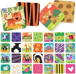 Set obsahuje 50 kartičiek (25 dvojíc) s logickým rozdelením zvierat podľa prostredia: lúka, prales, savana, les a farma. Vďaka tvrdým a odolným kartám aj výrazným farbám a tvarom je hra atraktívna a dlhodobo použiteľná. Ponúka viac variantov hrania a skvele sa hodí pre predškolské deti vo veku 3–6 rokov.