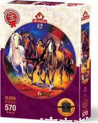 Originálne spojenie zábavy a funkčnosti: poskladajte si okrúhle puzzle s motívom bežiaceho stáda koní a premeňte ho na plne funkčné nástenné hodiny. Balenie obsahuje všetko potrebné vrátane hodinového strojčeka a rámu. Vďaka priemeru cca 46 cm získate výraznú dekoráciu do každého interiéru.
