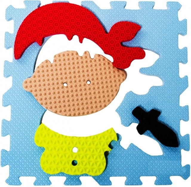 Penové puzzle s pirátskou tematikou premenia každú izbu na bezpečnú hernú zónu. Deväť vzájomne prepojiteľných dielov s vyberateľnými tvarmi a rôznymi povrchovými štruktúrami zaujme deti farbami aj hmatom. Materiál je príjemne mäkký, ľahko sa čistí a tlmí nárazy aj hluk.