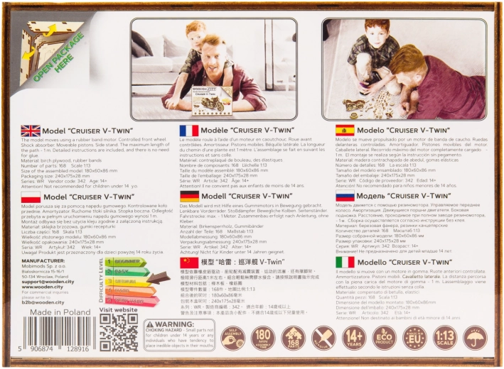 V modeli sú zastúpené detaily skutočného motocykla: - funkčný stojan, - smerové svetlo, - evidenčné číslo, - odrazky, - spätné zrkadlá. 3D puzzle WOODEN CITY Cruiser V-Twin bude najlepším darčekom pre každého milovníka motocyklov.