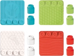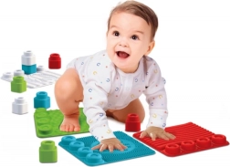 Každá podložka má štyri pozície pre kocky, takže si deti môžu vytvárať farebné kombinácie, skladať, rúcať a znovu stavať. Mäkký, testovaný a nezávadný materiál je bezpečný pre detské skúmanie a ľahko sa udržiava: podložky aj kocky možno umývať v umývačke do 30 °C.