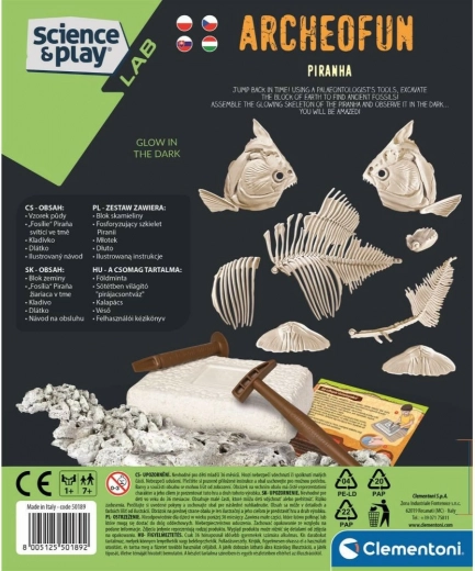Staňte sa malým paleontológom a objavte kostru dravej ryby – piranhe! Táto zábavná archeologická sada od značky Clementoni umožní deťom pomocou priložených nástrojov opatrne „vyťažiť“ fosíliu a poskladať si svietiacu kostru piranhe. Podľa ilustrovaného návodu sa dozviete viac o fosíliách, ich vzniku a o tom, kde dnes piranhe žijú. Skvelá voľba na rozvoj zručnosti, tvorivosti a záujmu o vedu.