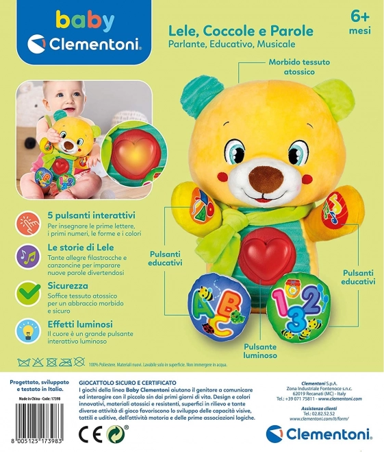 Interaktívny plyšový medvedík Gombík od BABY CLEMENTONI je ideálny spoločník pre najmenších. Vďaka mäkkému hebkému prevedeniu a pestrým farbám podporuje zmyslový rozvoj, zatiaľ čo šikovné funkcie deti hravou formou zoznamujú s abecedou, číslami, tvarmi a farbami. Svietiace srdce na brušku sprevádza hovorené frázy, pesničky a riekanky.