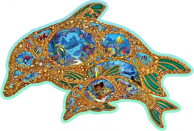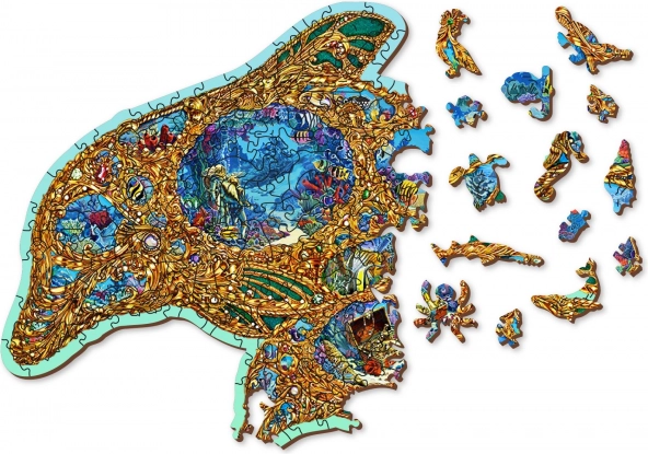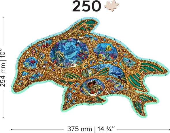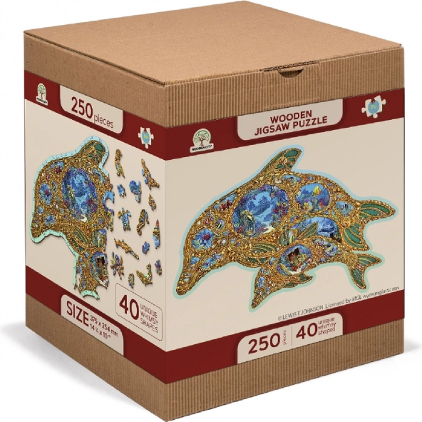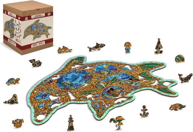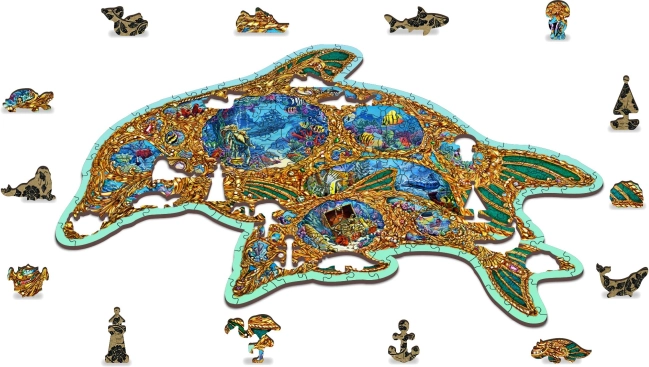 Doprajte si originálnu zábavu s dreveným puzzlom v tvare delfína inšpirovaným podmorským svetom. Vďaka špeciálne tvarovaným dielikom – z ktorých časť má podobu morských živočíchov – je skladanie vizuálne atraktívne a zároveň náročnejšie než pri klasických puzzliach. Laserom zvýraznené detaily dodávajú motívu hĺbku a niektoré dieliky možno postaviť ako drobné figúrky.