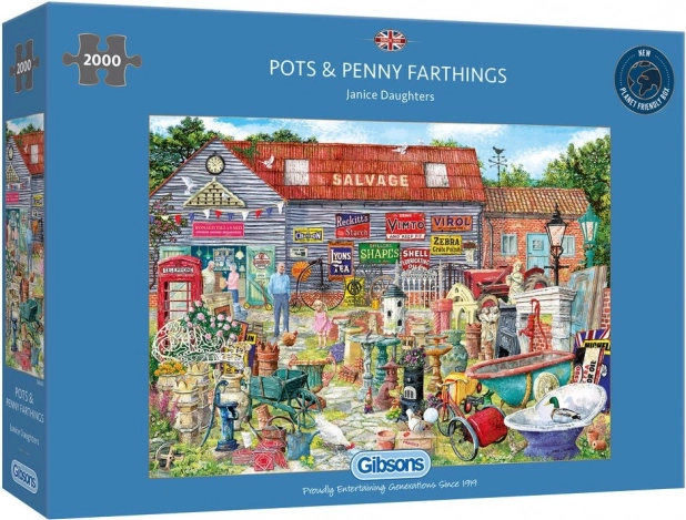 Objavte kúzlo nostalgie s veľkým puzzle od Gibsons – Hrnce a haraburdy za pár drobných o 2000 dielikoch. Čaká vás detailne ilustrovaná scéna z dvora plného pokladov, ktorá nadchne milovníkov starožitností aj náročných skladateľov. Súčasťou je predloha motívu a po zložení vznikne kvalitný, veľkoformátový obraz s rozmerom 98 × 68 cm.