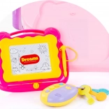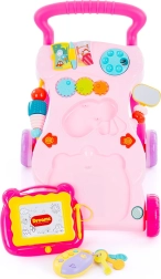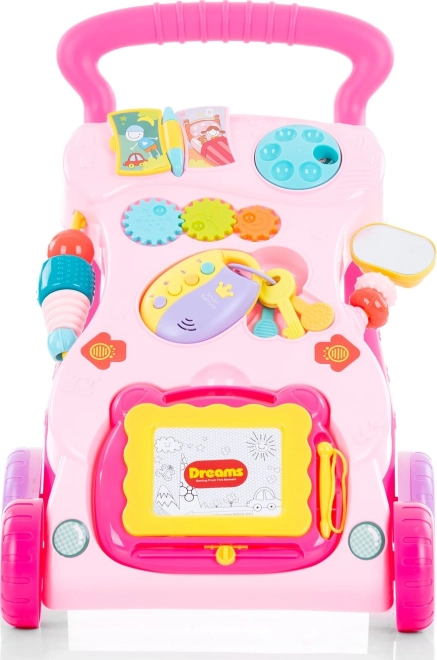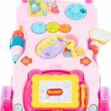 Súčasťou je kresliaca tabuľka s perom, zrkadielko, farebné ozubené kolieska, tlačidlá a kľúče s „chytrým“ ovládačom. Odnímateľné hračky možno používať aj samostatne, čo predlžuje zábavu a podporuje kreativitu. Chodítko prehráva svetlá, melódie a zvuky, čím stimuluje sluch, zrak aj sústredenie. Balené v darčekovej krabici – skvelý tip na darček.
