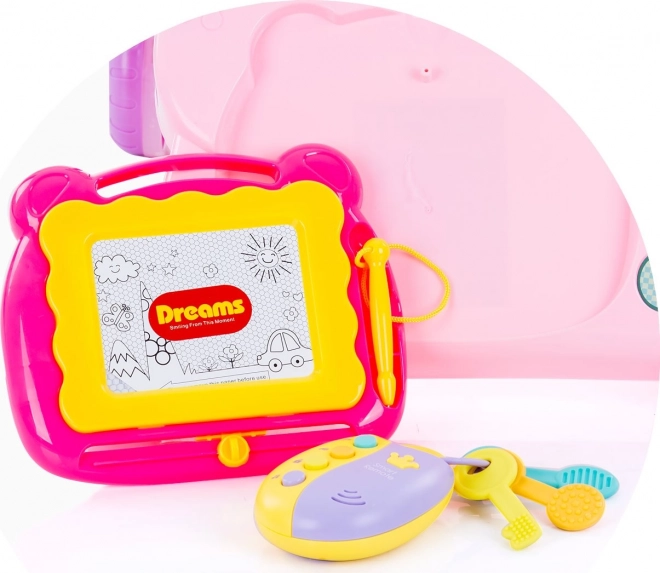 Kresliaca tabuľka s perom, ozubené kolieska, tlačidlá, zrkadielko a kľúče s ovládačom rozvíjajú jemnú motoriku, zrak aj sluch.