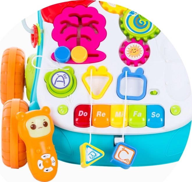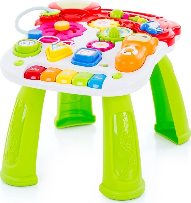 Stolík ponúka tlačidlá, ozubené kolieska a mini klaviatúru s notami, ktoré podporujú jemnú motoriku, koordináciu oko–ruka a vnímanie rytmu.