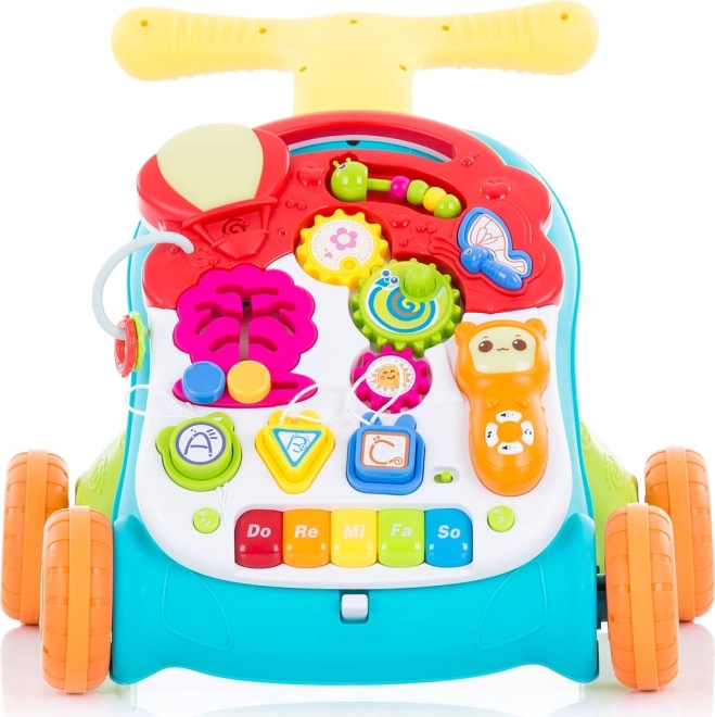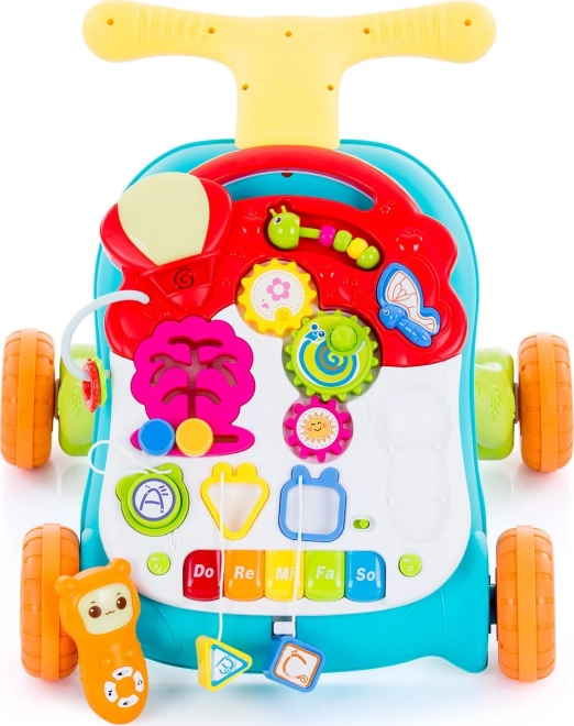 Premyslené chodítko na tlačenie je ideálne pre deti, ktoré už vedia samostatne chodiť. Stabilná základňa a ľahká konštrukcia dodávajú istotu pri prvých krôčikoch, zatiaľ čo pestré farby a zvuky podnecujú zrak, sluch aj zvedavosť. Hračku premeníte behom chvíľky na samostatný herný stolík na skúmanie a kreatívnu hru.