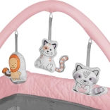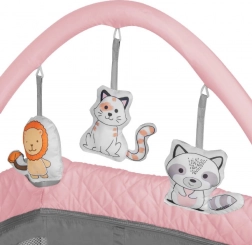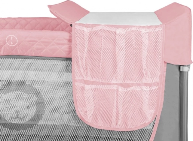 Súčasťou je prebaľovací pult so zvýšenými okrajmi, oblúk s hračkami na rozvoj zmyslov a praktické vrecká a priehradky na potreby. Bočný vchod na zips poskytne starším deťom nezávislý prístup, zatiaľ čo sieťované steny zabezpečujú cirkuláciu vzduchu a neustály dohľad.