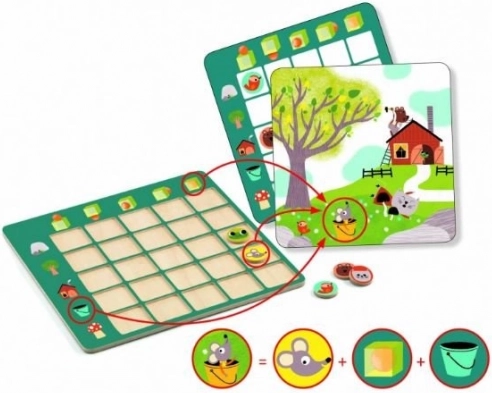 DJECO Topologix je chytrá vzdelávacia hra, ktorá pomáha deťom porozumieť vzťahom v priestore. Úlohou je správne prepojiť zvieratko s objektom na karte a určiť, či je nad, pod, na, vnútri alebo vedľa. Deti sa učia formou hry, trénujú sústredenie a posilňujú jemnú motoriku pri manipulácii so žetónmi.