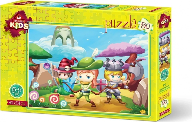 Objavte zábavu pre najmenších s kvalitným puzzle s 50 dielikmi, ktoré rozvíjajú logické myslenie, trpezlivosť a jemnú motoriku. Obrázok „Traja malí hrdinovia“ poteší deti aj rodičov a po zložení má rozmer približne 48 × 34 cm.