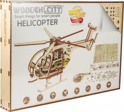 Funkčný drevený vrtuľník s rotujúcimi lopatkami, imitujúci skutočný model.