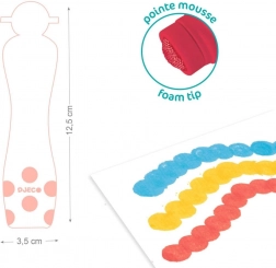 Penové farby DJECO s praktickým hubkovým aplikátorom sú ideálnou voľbou pre prvé tvorenie. Deti jednoducho pritlačia a robia bodky, ťahy aj vzory – bez štetcov a bez neporiadku. Ergonomicky tvarované fľaštičky padnú aj do drobných detských rúčok a podporujú prirodzený úchop.