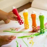 Špeciálne tvarované fľaštičky s protišmykovými bodkami sa deťom dobre držia a uľahčujú prvé výtvarné pokusy bez únavy ruky.