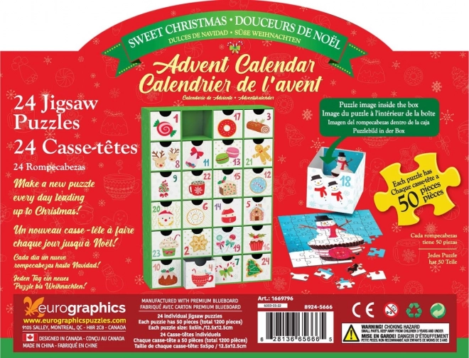 Adventný kalendár EUROGRAPHICS „Sladké Vianoce“ premení december na hravú tradíciu. Každá z 24 zásuviek ukrýva štvorcové puzzle s 50 dielikmi s lahodnými motívmi cukroviniek. Obrázky majú rozmer 12,5 × 12,5 cm a predloha je vytlačená na zadnej strane každej zásuvky pre jednoduché skladanie.