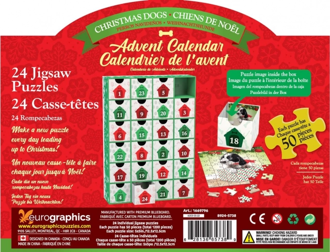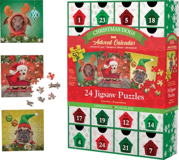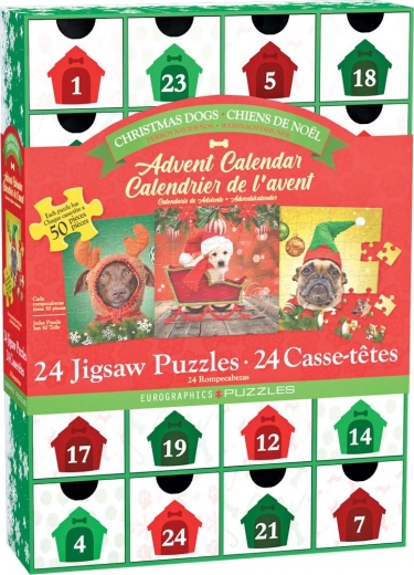 Skráťte si čakanie na Štedrý deň s originálnym adventným kalendárom EUROGRAPHICS, ktorý ukrýva 24 mini puzzle s motívom vianočných psíkov. Každý deň poskladáte 50-dielne puzzle s rozmerom 12,5 × 12,5 cm. Pevná krabica s 24 zásuvkami je znovupoužiteľná – budúci rok ju ľahko naplníte drobnými prekvapeniami.