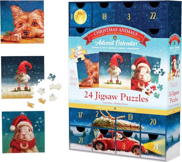 Spríjemnite si čakanie na Štedrý deň s originálnym adventným kalendárom EUROGRAPHICS, ktorý ukrýva 24 samostatných puzzle s motívom vianočných zvieratiek. Každý deň poskladáte 50-dielne štvorcové puzzle s rozmerom 12,5 × 12,5 cm a otvoríte ďalšiu zásuvku. Kalendár je znovu použiteľný a vďaka praktickým priehradkám ho budúci rok ľahko naplníte drobnosťami alebo sladkosťami.