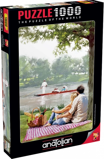 Puzzle Piknik pri rieke ponúka jedinečnú zábavu s 1000 dielikmi a praktickým stojanom na vrchnák krabice ako vzor pri skladaní.