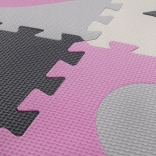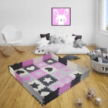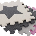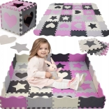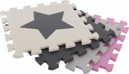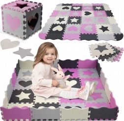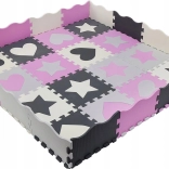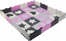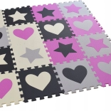 Štýlová penová podložka s motívom sŕdc a hviezd v ružovej a sivej farbe vytvorí deťom od 3 rokov bezpečné a pohodlné miesto na hranie. Diely do seba ľahko zapadajú, podložka je mäkká, umývateľná, tlmí hluk a izoluje od chladu. Súčasťou sú aj okrajové a rohové diely pre čistý zakončený okraj.