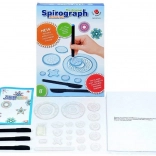 V balení nájdete ozubené diely spirografu, 3 farebné fixky, listy A4 a obrázkový návod – stačí otvoriť a začať kresliť.