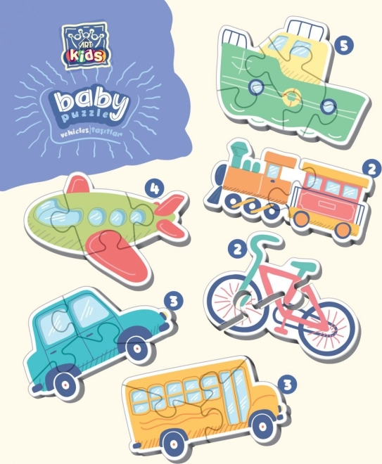 Sada Baby Puzzle Dopravné prostriedky od ART je ideálna pre rozvoj kognitívnych schopností a jemnej motoriky detí. Vďaka ľahko udržateľnému povrchu a kartónu o hrúbke 2,5 mm, ponúka táto hračka bezpečnú a zábavnú aktivitu.