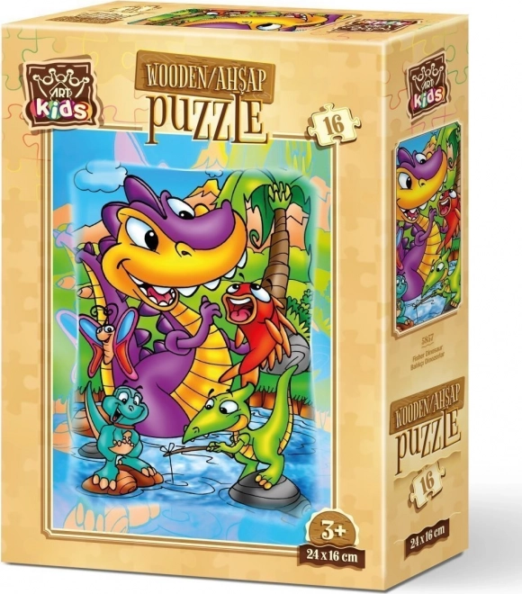 Zábavné drevené puzzle s motívom dinosaurov pri rybárčení poteší malých staviteľov aj začiatočníkov. Obsahuje 16 pevných dielikov z tenkej drevenej preglejky a po zložení má veľkosť cca 16 × 24 cm.