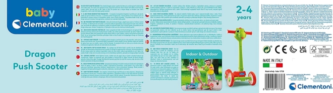 Roztomilá detská kolobežka v tvare dráčika od CLEMENTONI BABY podporí prvé jazdy malých pretekárov. Má robustný rám, tri gumové kolieska pre stabilitu a mäkké gumové rukoväte. Skvele sa hodí na doma aj von a pomáha rozvíjať rovnováhu, koordináciu a pohybové zručnosti.