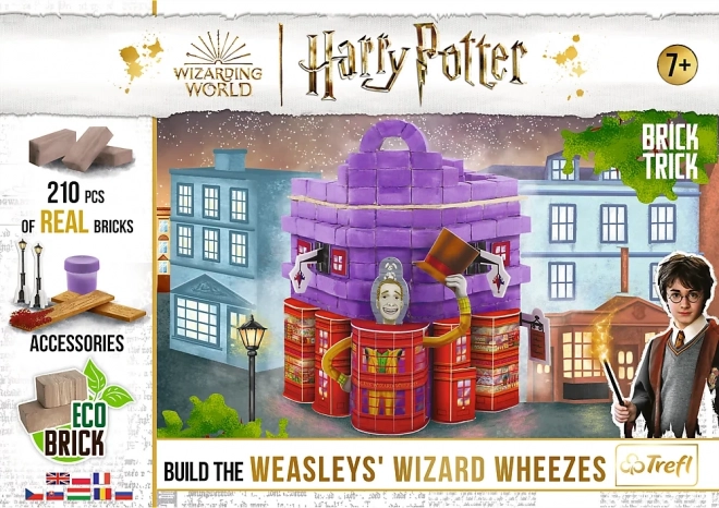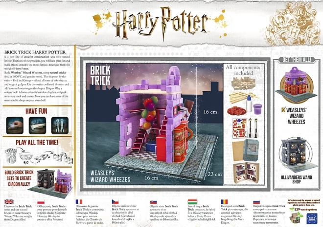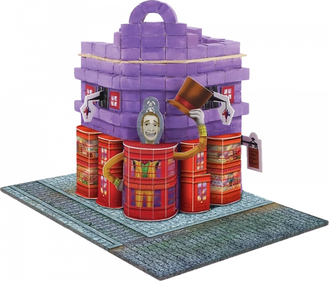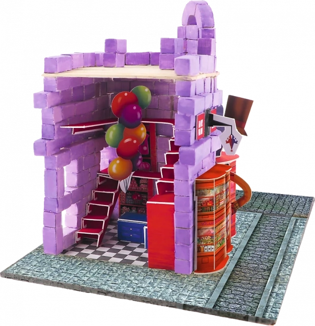 Vytvorte si doma čarodejnícky kútik s farebným obchodom dvojčiat Freda a Georgea. Sada Brick Trick kombinuje skutočné materiály – mini tehličky a drevené doštičky – s dekoráciami, ktoré dodajú stavbe charakter. Krok za krokom postavíte budovu od základov až po hotový model a nakoniec ju dozdobíte priloženými prvkami.