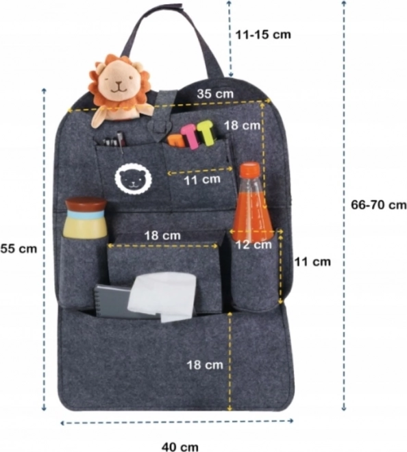 Univerzálny organizér do auta LIONELO je ideálny pomocník pre rodiny aj častých cestovateľov. Vďaka premyslenému rozvrhnutiu vreciek uložíte hračky, nápoje, vreckovky aj drobnosti prehľadne a bezpečne. Neutrálna sivá farba sa hodí do každého interiéru a zároveň chráni zadnú časť sedadla pred okopmi a znečistením.