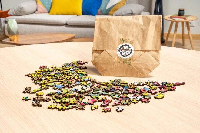 Toto unikátne puzzle je vyrobené z dreva s vysokokvalitnou farebnou potlačou. Každý dielik má celkom unikátny tvar, čo poskytuje vzrušujúce stavanie. Nájdete tu dieliky, ktoré pripomínajú skutočné zvieratá, kvety a iné predmety z reálneho života.
