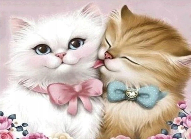 - Výsledkom je trblietavý obraz s romantickým motívom zamilovaných mačiek.