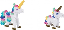 Kreatívna sada Plus-Plus Nauč sa stavať Jednorožce obsahuje 275 dielikov a základnú dosku, ktorá umožňuje stavať 2D a 3D jednorožce podľa podrobného návodu.