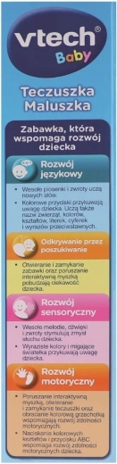 Interaktívna zložka pre najmenších od značky VTech zábavnou formou učí a rozvíja deti od 6 mesiacov. Vďaka dotykovej obrazovke, 9 farebným tlačidlám a veselým melódiám a pesničkám sa deti zoznámia s písmenami, tvarmi, číslami, názvami zvierat a hudobných nástrojov. Blikajúce svetielka a animácie priťahujú pozornosť, zatiaľ čo stláčanie tlačidiel podporuje jemnú motoriku.